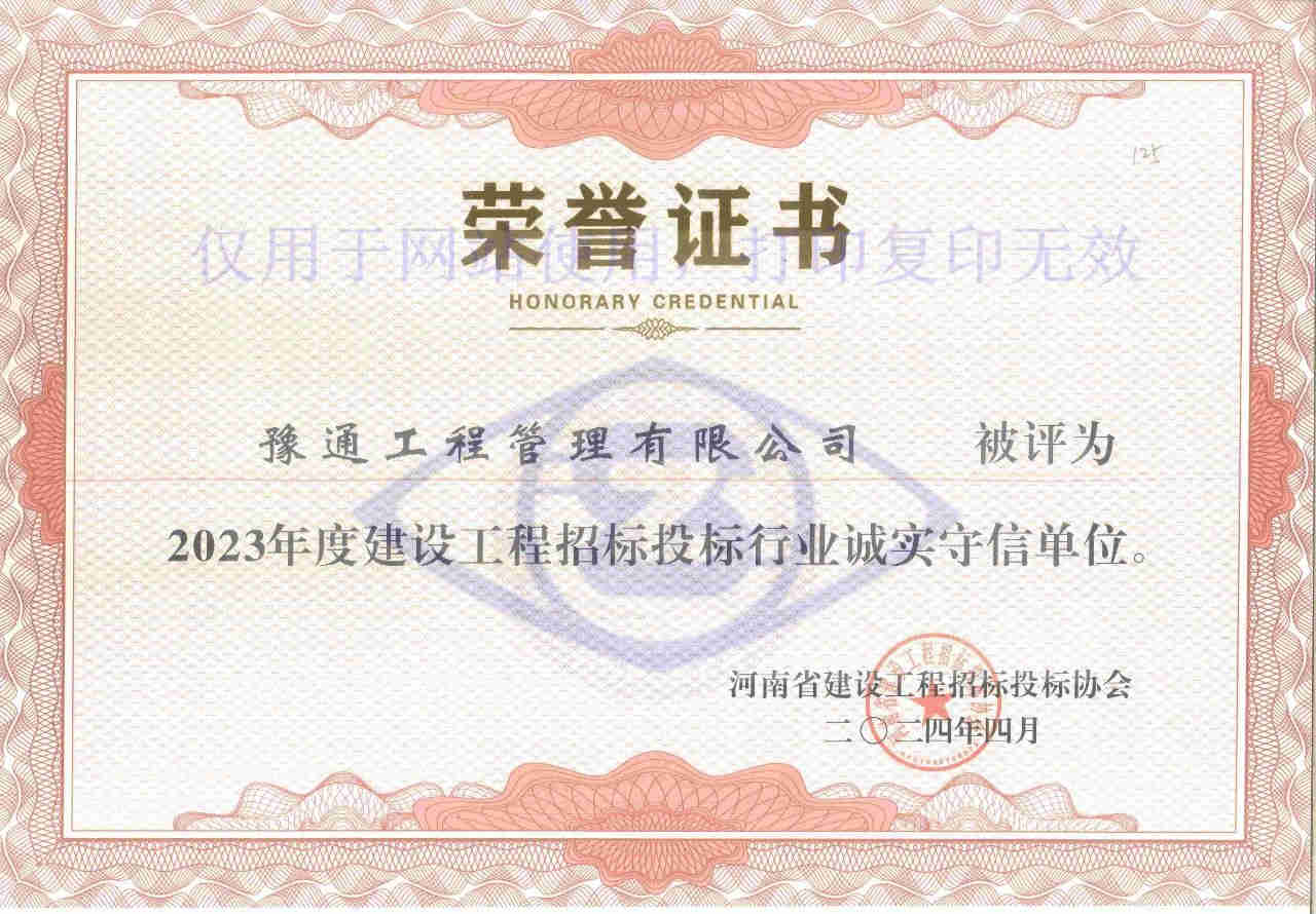 近日,河南省建設(shè)工程招標(biāo)投標(biāo)協(xié)會發(fā)布了《關(guān)于公布2023年度建設(shè)工程招標(biāo)投標(biāo)行業(yè)誠實守信單位的通知》(豫建招協(xié)字〔2024〕11號),我公司榮獲“2023年度建設(shè)工程招標(biāo)投標(biāo)行業(yè)誠實守信單位”榮譽(yù)稱號。